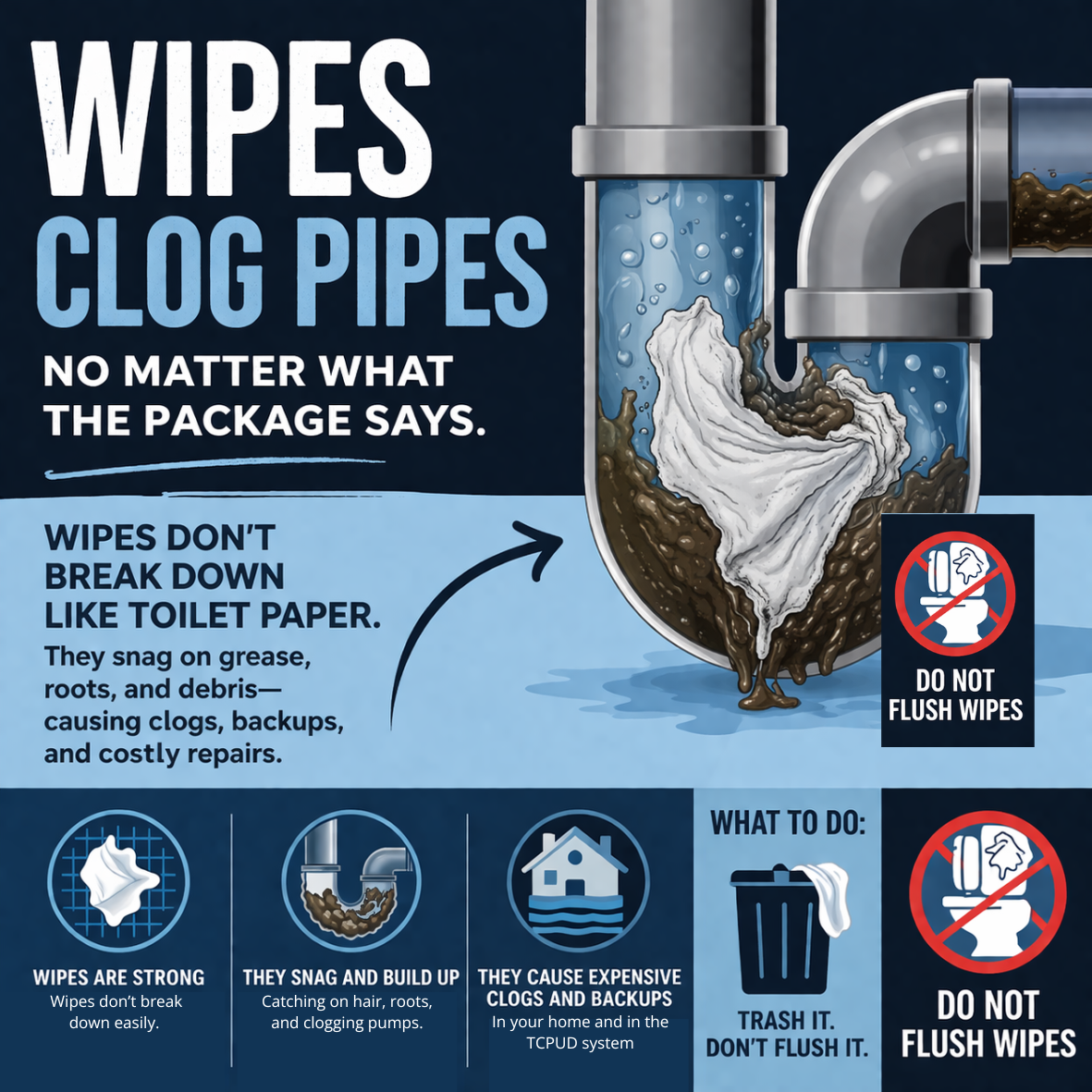 No matter what the package says, wipes clog pipes. Wipes are stronger than toilet paper and don't break down easily. They snag and build up, catching on hair, roots, and debris, and clogging TCPUD sewer pumps. This causes expensive clogs and backups in your home and in the TCPUD system. Trash wipes, don't flush them. What Can Go Down the Toilet?To protect your plumbing, the environment, and our community sewer system, only flush the 3 Ps: Pee, Poop, and (Toilet) Paper — single-ply preferred. If it’s not one of the 3 Ps, it should not be flushed. Water from sinks, showers, bathtubs, washing machines, and dishwashers can safely go down the drain as usual. Did You Know?Many products labeled “flushable” are not sewer-safe. Wipes, floss, and other materials do not break down like toilet paper and can cause serious clogs in household plumbing and sewer mains. Dental floss is especially problematic. It doesn’t biodegrade and can wrap around pumps and snag inside pipes. Cigarettes never break down in the sewer system. Most sewer backups happen at home. About two-thirds of sewer backups occur in private sewer lines, not the District’s main lines. These backups are often caused by items flushed down toilets or put down garbage disposals. Why It MattersFlushing the wrong items can: